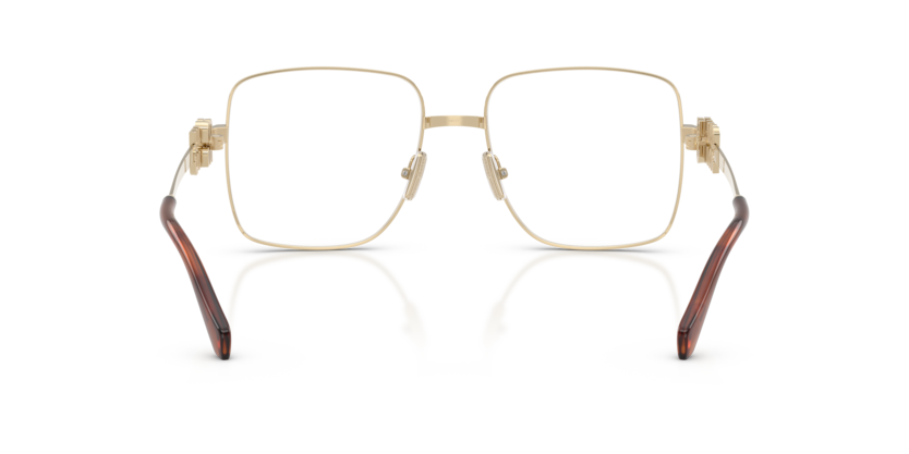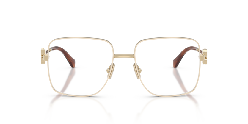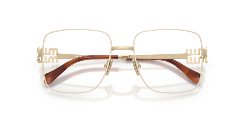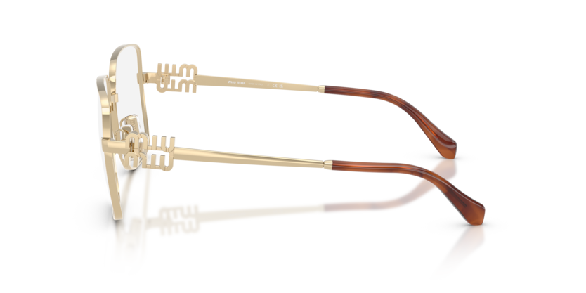 • Smukła metalowa ramka w geometrycznym kształcie z wyeksponowanym logo Miu Miu, lśniące wdzięcznie na zausznikach jako element zawiasu.