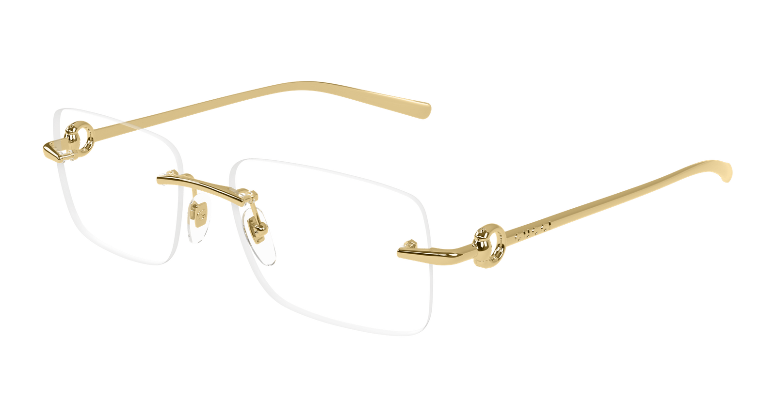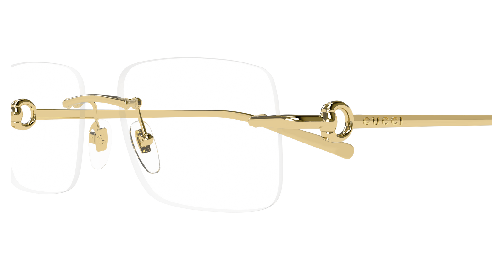 • Delikatny model w prostokątnym kształcie w bezramkowej oprawie. Subtelny model, zwracający uwagę pięknymi zausznikami z eleganckim logowaniem horsebit Gucci.